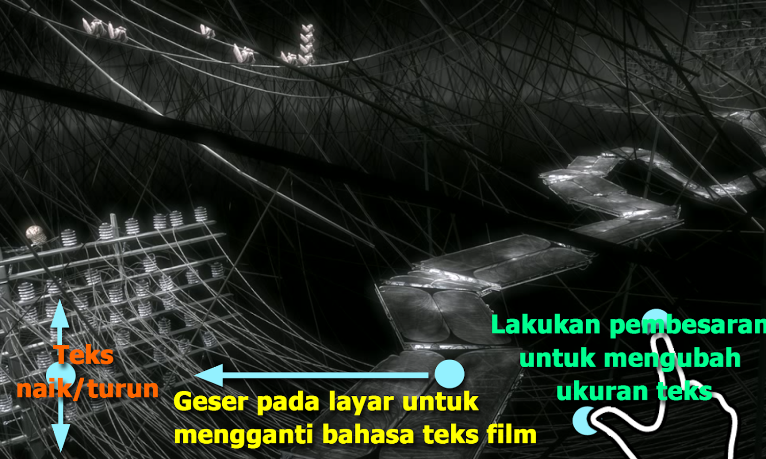 d) GERAKAN TEKS FILM - Gulir maju/mundur untuk pindah ke teks berikutnya/sebelumnya, Atas/bawah untuk menggerakan teks naik dan turun, Memperbesar/memperkecil untuk mengubah ukuran teks.